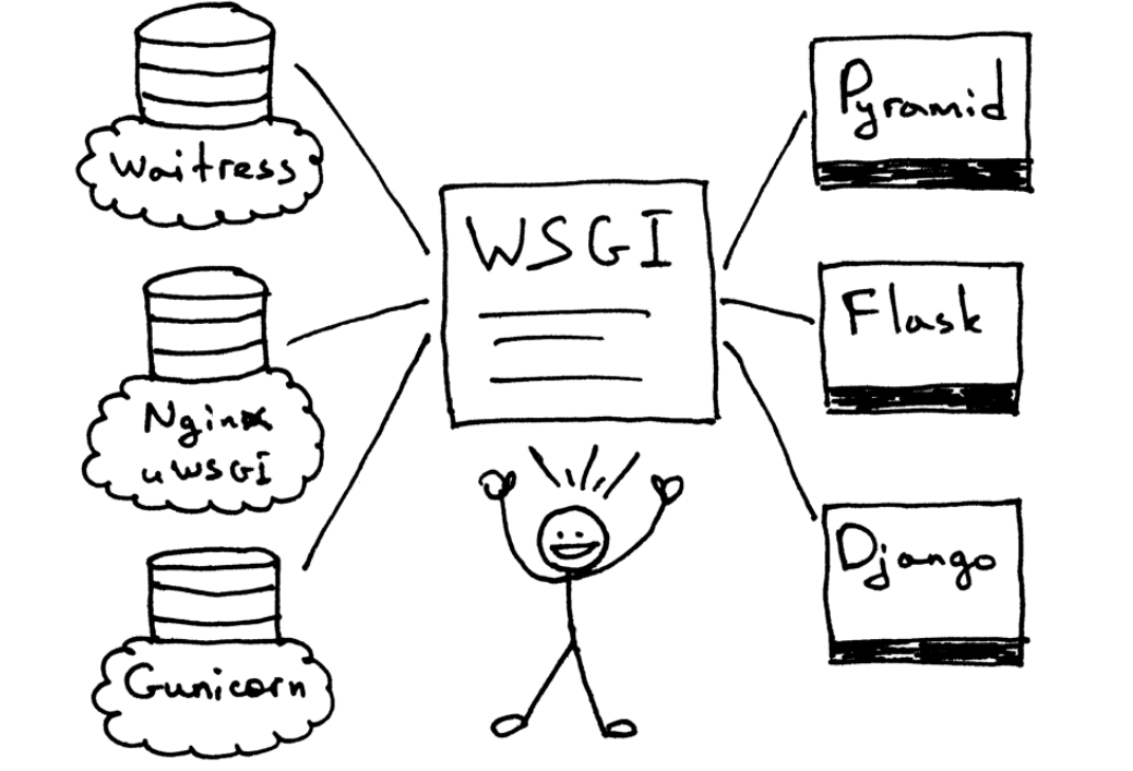 那么,怎么可以不修改服务器和架构代码而确保可以在多个架构下运行web服务器呢?答案就是 Python Web Server Gateway Interface (或简称 WSGI,读作“wizgy”)。