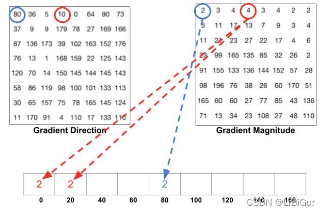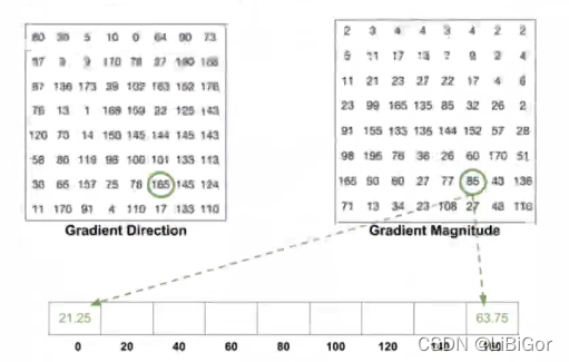 我们将上一步得到的梯度方向投影到9个通道中,并将梯度幅值作为投影时的权值。