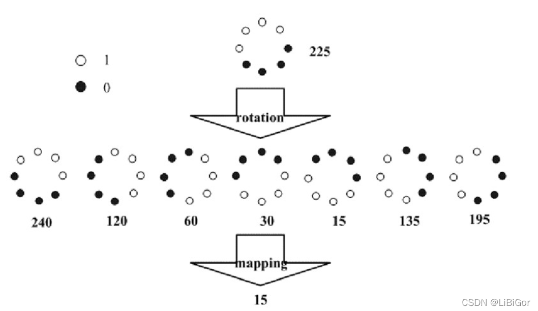 其中,ROR(x,i)ROR(x,i)指沿顺时针方向旋转LBP算子i次。如下图所示: