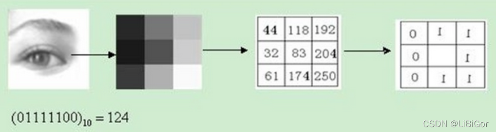 原始的LBP算子定义为在$33$的窗口内,以窗口中心像素为阈值,将相邻的8个像素的灰度值与其进行比较,若周围像素值大于中心像素值,则该像素点的位置被标记为1,否则为0。这样,$33$邻域内的8个点经比较可产生8位二进制数(通常转换为十进制数即LBP码,共256种),即得到该窗口中心像素点的LBP值,并用这个值来反映该区域的纹理信息。如下图所示:
