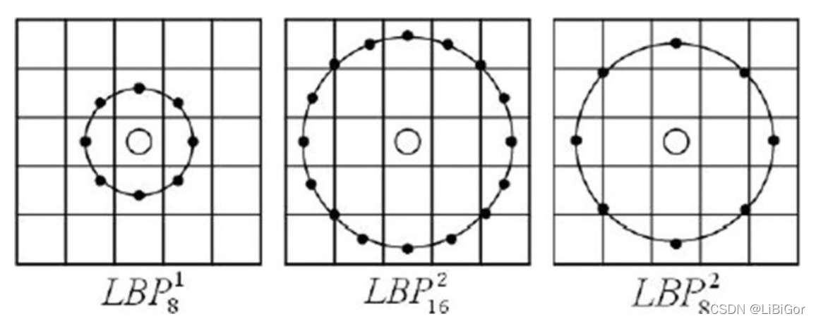 新的LBP算子$LBP_{p}^{R}$计算不同半径邻域大小和不同像素点数的特征值,其中P表示周围像素点个数,R表示邻域半径,同时把原来的方形邻域扩展到了圆形,下图给出了三种扩展后的LBP例子,其中,R可以是小数: