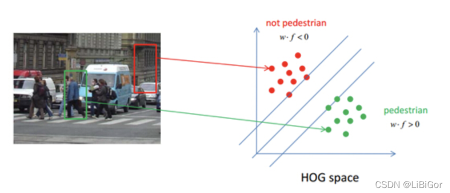 从上图中,我们可以发现直方图的主要方向捕捉了人的外形,尤其是躯干和腿的部位。我们得到归一化的HOG特征之后,就可以使用分类器对行人进行检测,比如使用支持向量机SVM进行人与背景的分类,如下图所示: