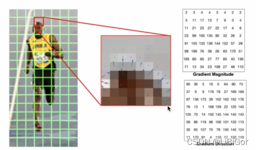 - 梯度方向直方图:将图像划分成小cells(例如8*8像素/cell), 统计每个cell的梯度直方图(不同梯度的个数),即可形成每个cell的描述符