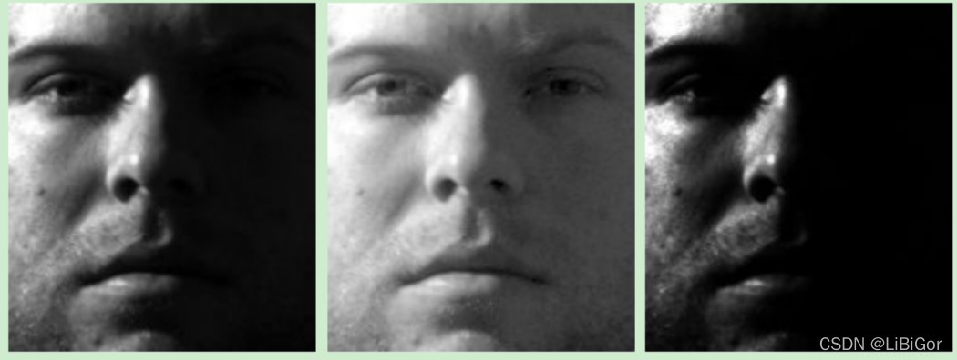 - 当γ<1时,如上图中虚线所示,在低灰度值区域内,动态范围变大(当x在[0,0.2]时,y的范围是[0,0.5]),进而图像的对比度增强;在高灰度值区域内,动态范围变小(当x在[0.8,1]时,y的范围是[0.9,1]),图像的对比度降低;同时,图像整体的灰度值变大。