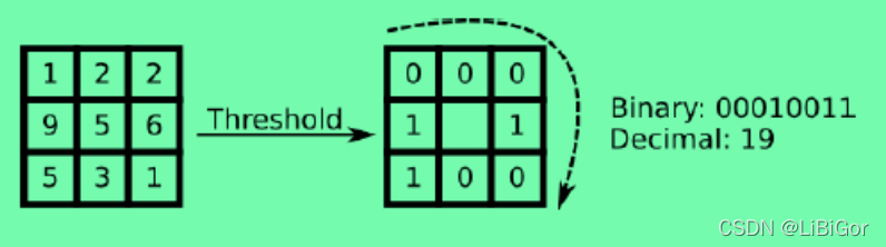 LBP值是从左上角像素,顺时针旋转得到的结果,如下图所示: