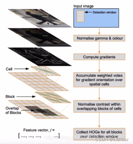 HOG特征检测算法的几个步骤:颜色空间归一化—>梯度计算—>梯度方向直方图—>重叠块直方图归一化—>HOG特征。如下图所示: