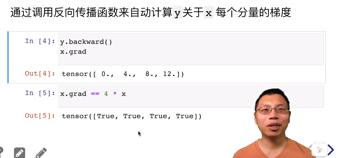 x.grad: tensor([ 0., 4., 8., 12.]) x.grad == 4*x: tensor([True, True, True, True])