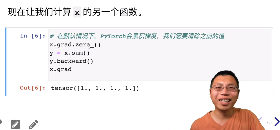 x: tensor([0., 1., 2., 3.], requires_grad=True) y: tensor(6., grad_fn=<SumBackward0>) x.grad: tensor([1., 1., 1., 1.])