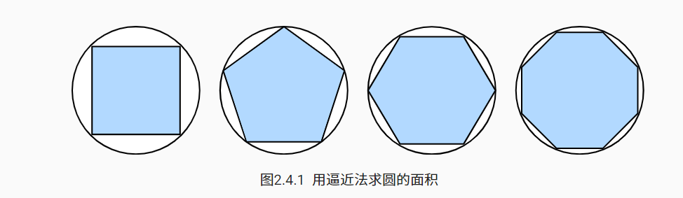 在2500年前,古希腊人把一个多边形分成三角形,并把它们的面积相加,才找到计算多边形面积的方法。 为了求出曲线形状(比如圆)的面积,古希腊人在这样的形状上刻内接多边形,内接多边形的等长边越多,就越接近圆。这个过程也被称为逼近法。