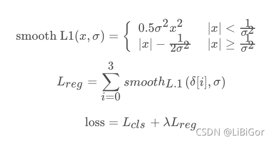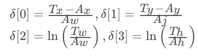 损失函数与faster-RCNN 中的损失函数类似,分类损失为交叉熵损失,回归损失采用归一化坐标的smooth L1 损失进行回归。Ax,Ay ,Aw,Ah表示anchors的中心点和宽高,Tx ,Ty,Tw,Th表示groundtruth的中心点和形状,标准化距离为: