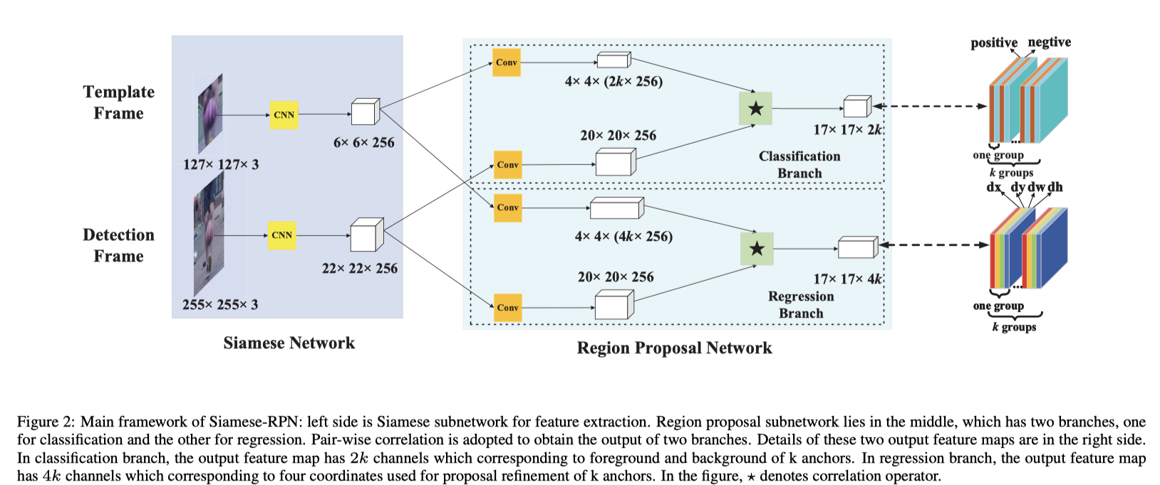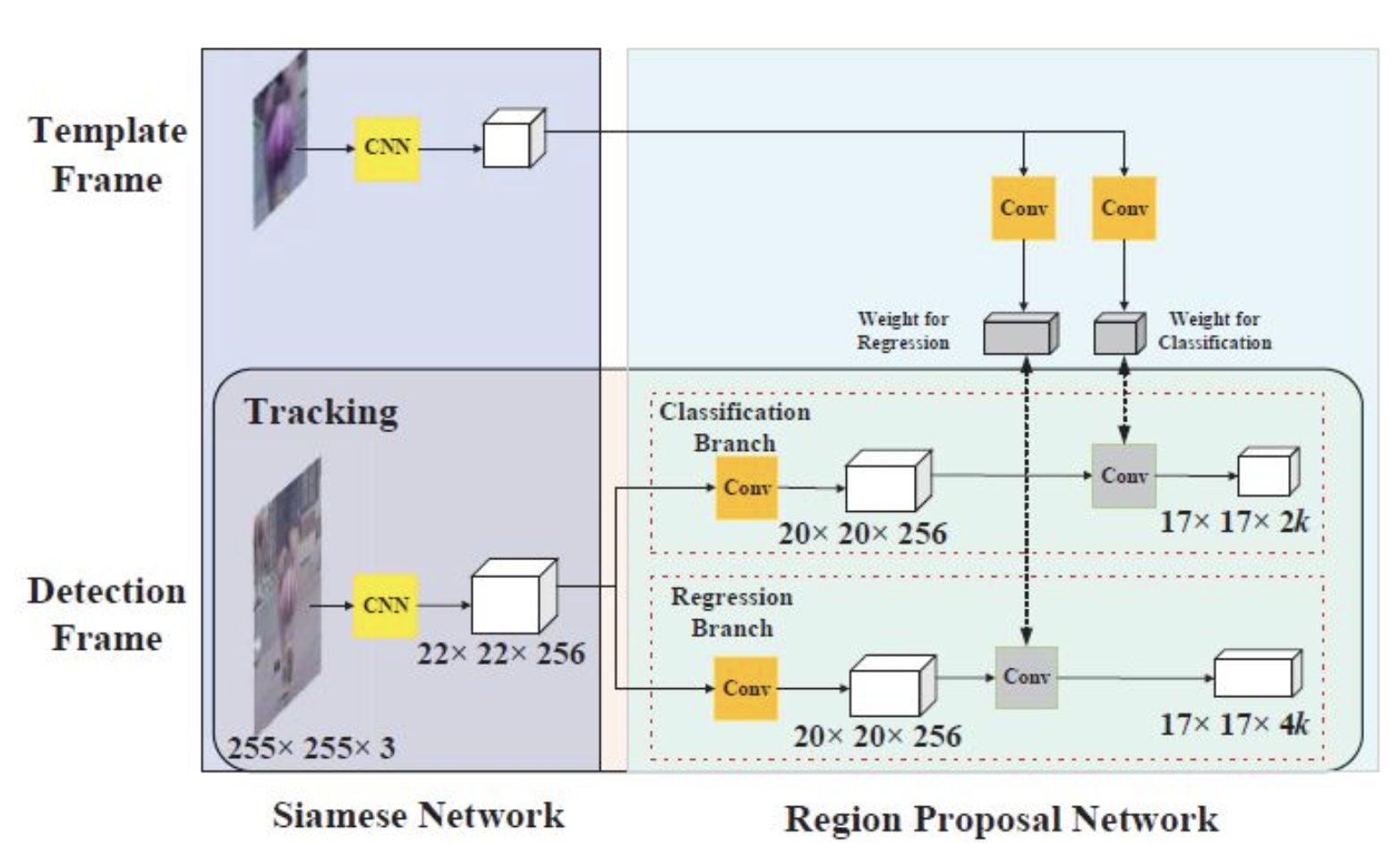 Siam-RPN提出了一种基于RPN的孪生网络结构,由孪生子网络和RPN网络组成,前者用来提取特征,后者用来产生候选区域。其中,RPN子网络由两个分支组成,一个是用来区分目标和背景的分类分支,另外一个是微调候选区域的回归分支,使整个网络实现了端到端的训练。
