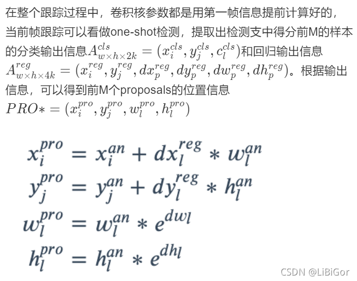 检测帧在对每一帧目标进行检测时就是对proposals进行分类,即相当于一个分类器。该分类器进行分类时需要一个响应得分图,该响应图是由检测帧特征图用模板帧特征图作为卷积核进行卷积得到的。标识有weight for regression和weight for classification即为模板帧特征图,它用第一帧图像信息进行训练(也就是的one-shot策略,只用第一帧图像信息训练出一层网络的参数),然后将训练好的参数作为卷积核用到检测支中,对检测帧特征进行卷积得到响应图featuremap。(分类的是:17×17×2k,回归的是:17×17×4k)