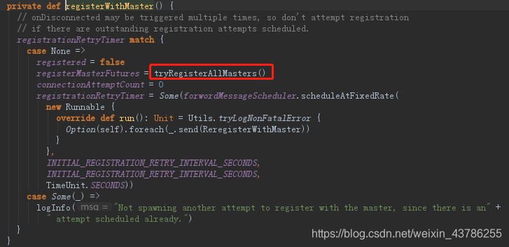 (2)这里面调用了registerWithMaster,这里面用了tryRegisterAllMaster方法向所有的master提交。