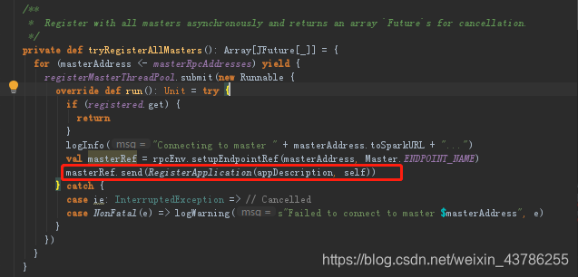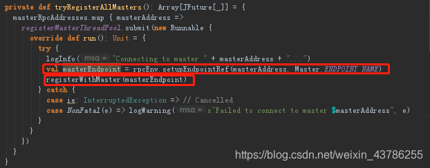(3)在具体注册向所有的master提交的时候,是用线程池的中一个线程来提交。然后就获得了masterEndpoint,获得了masterEndpoint之后,将其作为参数传入registerWithMaster方法。masterRpcAddresses是所有的master的地址,这里的map是进行对master进行逐个注册。这里发送给所有的master而不时发送给active是因为:如果不这样做的话,worker启动的时候就要搞明白谁是active的master,这样他的负担就加重了,就不符合强内聚,弱耦合的架构设计。
