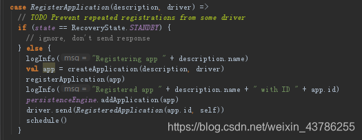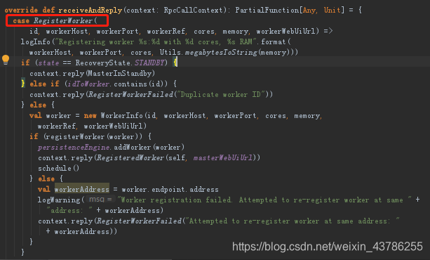 这个代码逻辑是:收到了worker启动注册的信息之后,首先判断一下自己的状态,如果是standby那肯定没戏。然后判断idToWorker这个HashMap中有没有这个worker,