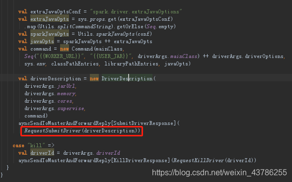 一个RpcEndpoint经历的过程依次是:构建->onStart→receive→onStop。其中onStart在接收任务消息前调用,receive和receiveAndReply分别用来接收另一个RpcEndpoint(也可以是本身)send和ask过来的消息。在他的onStart方法中调用ayncSendToMasterAndForwardReply方法向每个master发送RequestSubmitDriver这个case class他的参数是driverDescription也是个case class包含了driver的信息