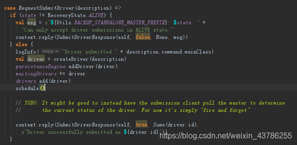 (2)master在接收到client发送过来的RequestSubmitDriver消息后,创建一个DriverInfo,然后persistenceEngine持久化引擎要把driver持久化起来,并且加入到waitingDrivers这个等待队列中