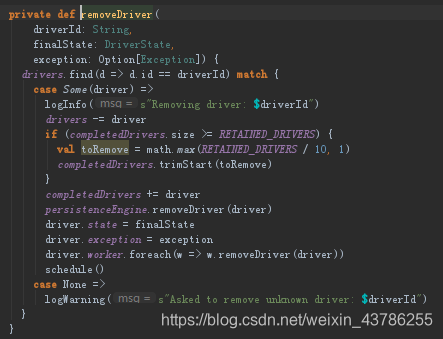 Driver的状态有SUBMITTED, RUNNING, FINISHED, RELAUNCHING, UNKNOWN, KILLED, FAILED, ERROR。当进行改变时会发送DriverStateChanged的消息给Master。如果状态是ERROR、FINISHED、KILLED、FAILED这几种情况,则调用removeDriver。