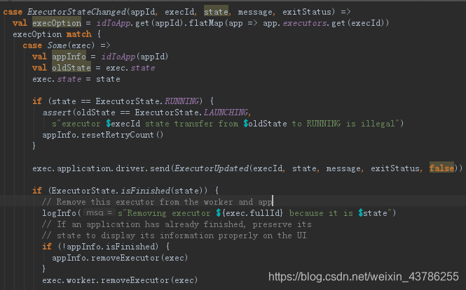 当Executor状态发送变化时也同时会更新在Master端的注册信息,收到的消息是ExecutorStateChanged