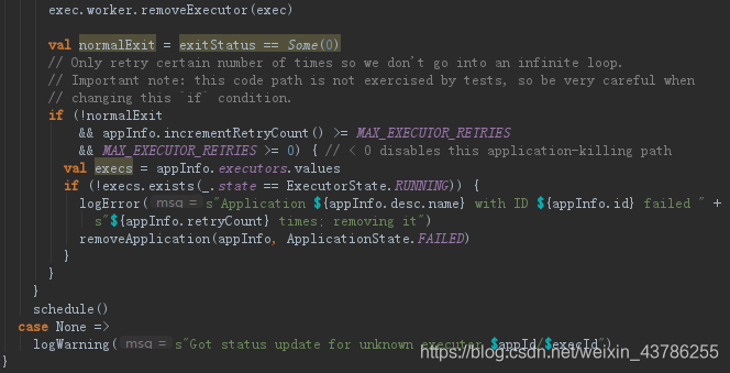 首先查一下已注册的executors中有没有这个executor。任何获得executorState信息 如果是RUNNING的状态resetRetryCount重置一下次数。就是Executor挂掉的时候会尝试一定次数的重启(最多重试10次)。这里只是记录次数。