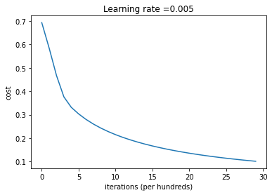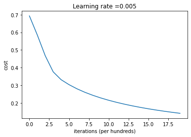 # GRADED FUNCTION: modeldef model(X_train, Y_train, X_test, Y_test, num_iterations = 2000, learning_rate = 0.5, print_cost = False):"""Builds the logistic regression model by calling the function you've implemented previouslyArguments:X_train -- training set represented by a numpy array of shape (num_px * num_px * 3, m_train)Y_train -- training labels represented by a numpy array (vector) of shape (1, m_train)X_test -- test set represented by a numpy array of shape (num_px * num_px * 3, m_test)Y_test -- test labels represented by a numpy array (vector) of shape (1, m_test)num_iterations -- hyperparameter representing the number of iterations to optimize the parameterslearning_rate -- hyperparameter representing the learning rate used in the update rule of optimize()print_cost -- Set to true to print the cost every 100 iterationsReturns:d -- dictionary containing information about the model."""### START CODE HERE #### initialize parameters with zeros (≈ 1 line of code)w, b = initialize_with_zeros(X_train.shape[0])# Gradient descent (≈ 1 line of code)parameters, grads, costs = optimize(w, b, X_train, Y_train, num_iterations, learning_rate, print_cost = print_cost)# Retrieve parameters w and b from dictionary "parameters"w = parameters["w"]b = parameters["b"]# Predict test/train set examples (≈ 2 lines of code)Y_prediction_test = predict(w, b, X_test)Y_prediction_train = predict(w, b, X_train)### END CODE HERE #### Print train/test Errorsprint("train accuracy: {} %".format(100 - np.mean(np.abs(Y_prediction_train - Y_train)) * 100))print("test accuracy: {} %".format(100 - np.mean(np.abs(Y_prediction_test - Y_test)) * 100))d = {"costs": costs,"Y_prediction_test": Y_prediction_test, "Y_prediction_train" : Y_prediction_train, "w" : w, "b" : b,"learning_rate" : learning_rate,"num_iterations": num_iterations}return d