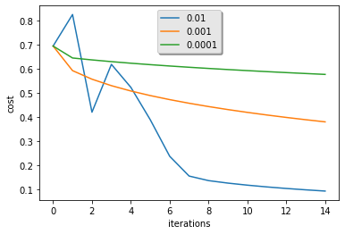 plt.xlabel('iterations')legend = plt.legend(loc='upper center', shadow=True)