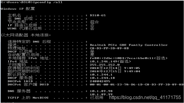 - 执行“ipconfig /all”命令,记录自己的ip地址、物理地址、网关地址、DNS服务器地址。