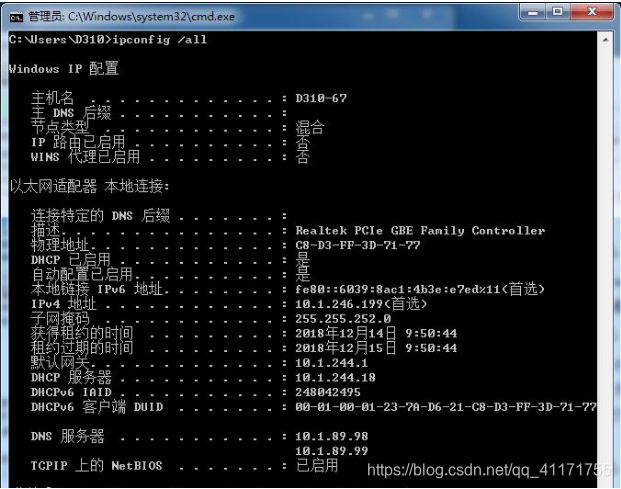 此同学的IP地址为:10.1.246.199物理地址为:C-8-D-3-F-F-3-D-7-1-7-7