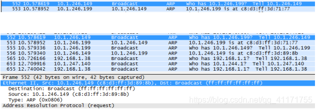 屏幕参数说明:由上我们可以看到我本机先通过广播的方式将10.1.146.149这个目的网络进行询问,并接收返回消息,以此确定目的网络的物理地址,然后目的网络主机也对我的主机广播询问物理地址一次,就双方都互相知道对方的物理地址,开始进行通信。