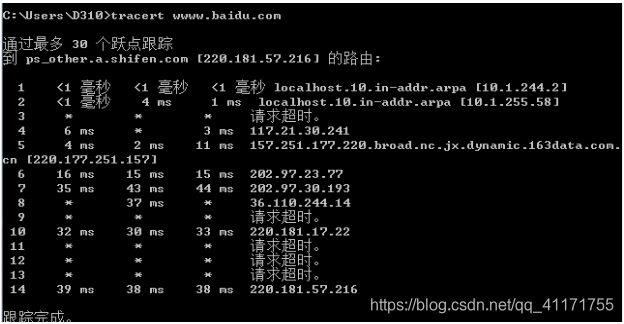 Tracert:用来探测本机到目标计算机之间的路由器IP地址,会从源主机到目标主机之间的每一台路由器都会返回响应的报头。最左侧的,1,2,3,4~14,这标明在我现在使用的宽带(使用的是移动宽带)上,经过11个路由节点,可以到达腾讯的服务。