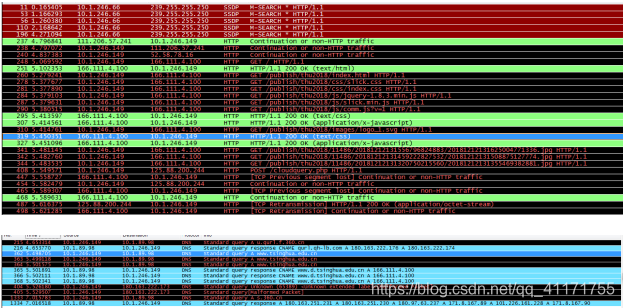 首先可以看到的是:HTTP的数据报,这里可以看到,我方的主机通过HTTP请求向清华网站服务器请求各种资源。我方主机发送HTTP请求 通过连接,客户端写一个ASCII文本请求行,后跟0或多个HTTP头标,一个空行和实现请求的任意数据。一个请求由四个部分组成:请求行、请求头标、空行和请求数据。服务端接受请求并返回HTTP响应清华服务器解析请求,定位指定资源。服务器将资源副本写至套接字,在此处由客户端读取。一个响应由四个部分组成;状态行、响应头标、空行、响应数据。