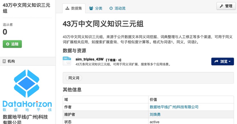 43万中文同义知识三元组,可用于同义词扩展相关应用,如搜索扩展查询、句子相似度计算、数据增强等场景;