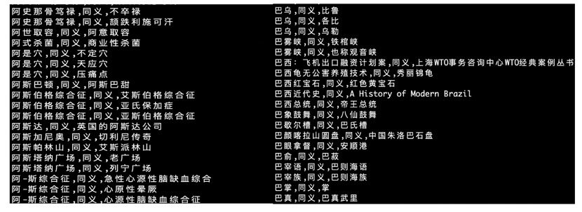 该数据集开放了43万中文同义知识三元组,来源于公开数据文本同义词挖掘、词典整理与人工修正等多个渠道。样例如下图所示: