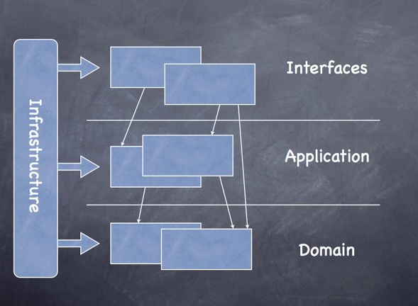 如图,该架构分为界面(Interfaces)、应用(Application)和领域(Domain)三层,以及一个基础设施(Infrastructure),是一种基于充血模型的、面向对象的分层方式。其各层职责如下: