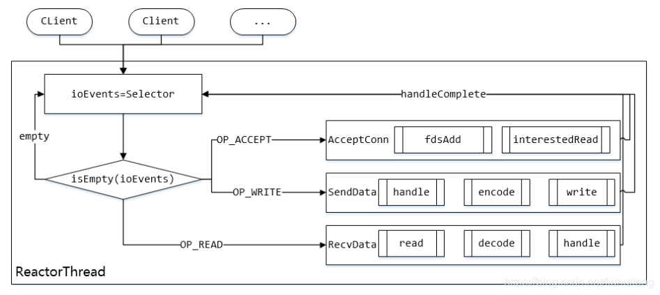注意上面的Selector之所以会有OP_ACEEPT事件,是因为在单线程模型中,Selector轮询的是监听套接字与已连接客户端套接字的所有IO事件。