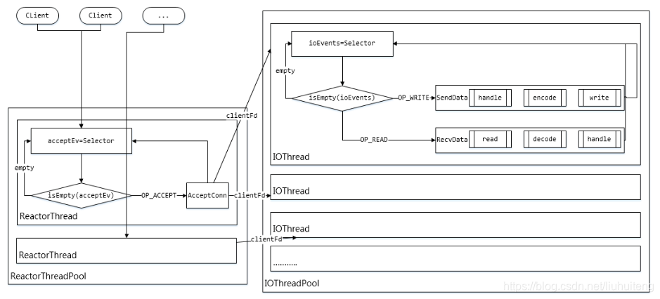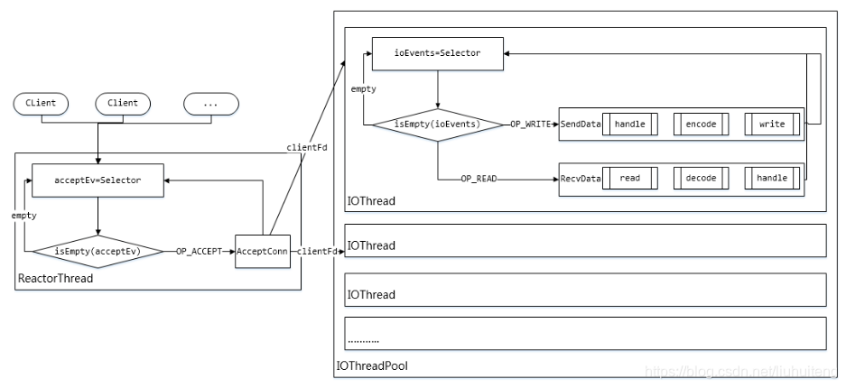 可以看到,这里把客户端的已连接套接字,转交给某个IO线程之后,由此线程轮询处理其之后的所有IO事件,这实际参考了netty4的线程模型设计。实际reactor的多线程模型,并不需要将已连接套接字绑定在某个线程上,也可以统一放在连接池中,由多个IOWork线程从池中取连接进行轮询并处理,但这样会复杂很多,而且容易出问题,比如说不同线程从同一个channel收到了write事件,这就类似惊群问题了;并且多线程并发操作同一个channel,后续很可能需要你将IO事件进行同步,与其如此,不如直接将channel绑定到一个线程,让channel上触发与处理IO事件逻辑上同步。netty3中channel(已连接套接字)入站事件由固定线程处理,出站事件由触发的线程处理,netty4中修改了设计,将channel绑定到固定的eventloop(线程)。