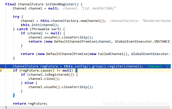在ServerBootstrap继承的initAndRegister方法中,调用MultithreadEventLoopGroup#register方法,此方法调用this.next获取当前索引的下一个(索引位0,即是第一个)EventLoop。