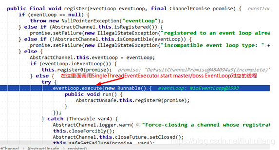 然后register方法进一步调用register方法,在register中执行eventLoop.execute,这里才会真正为监听套接字创建第一个轮询线程。