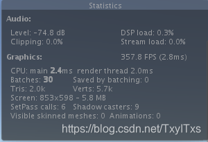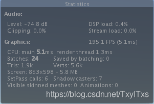 绘制调用(Draw Call):每次引擎准备数据并通知GPU的过程,即每帧调用显卡渲染物体的次数。即下图中的Batches。