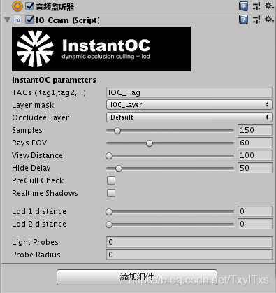 - 首先添加一个层IOC_Layer和一个标签IOC_Tag,将要做动态遮挡剔除的物体加入到该层中和选择该标签中,如下。