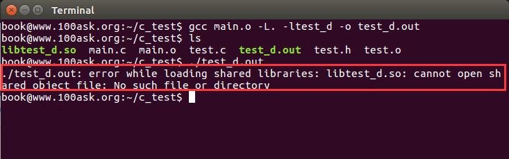 不能找到共享库文件libtest_d.so,加载失败。因为一般情况下Linux会在/usr/lib路径中搜索需要用到的库,而libtest_d.so库并不在这个路径下。解决方法有两种:一种就是把这个文件拷贝至/usr/lib路径下,但是一般不允许这样做,一般用户也不允许往这个路径里拷贝东西。另一种就是把当前路径增加为动态库的搜索路径,命令为:
