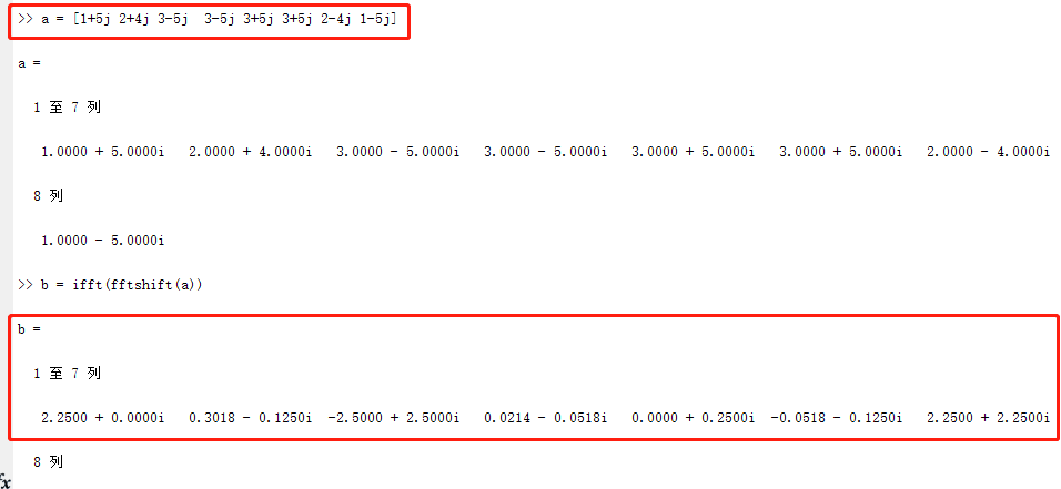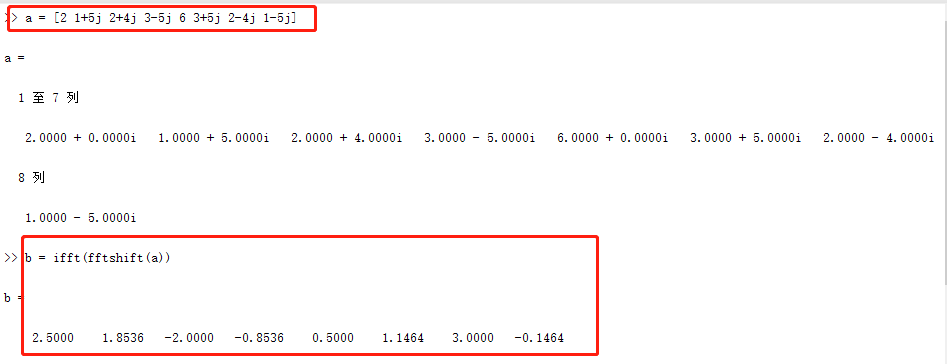 a = [2 1+5j 2+4j 3-5j 6 3+5j 2-4j 1-5j]b = ifft(fftshift(a))b =2.5000 1.8536 -2.0000 -0.8536 0.5000 1.1464 3.0000 -0.1464
