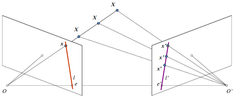 , 即左图中像素点 x 对应的右图中的像素点 x' 位于线段 l' 上