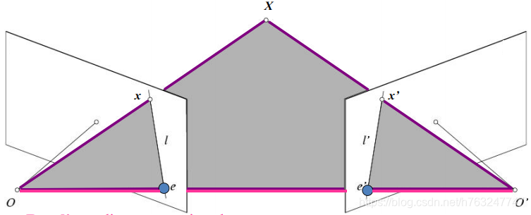 - 极线(epipolar lines): 极平面与两张图像的交线,如图中的 l ,l'。
