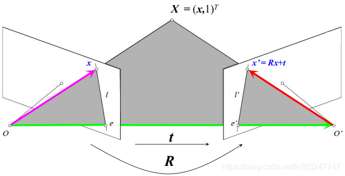 两者关系如下图所示,右边相机的位置可以通过旋转(R)和平移(T)得到。