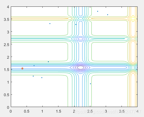 for i = 1:Num_iterationscontour(x,y,z,15); %show the contour of the objectvie functionhold on;%find the current best location(xo,yo)zn=f(xn,yn);zn_min=min(zn);xo=min(xn(zn==zn_min));yo=min(yn(zn==zn_min));zo=min(zn(zn==zn_min));plot(xn,yn,'.',xo,yo,'*');axis(range);beta=0.5;gamma=0.7;alpha=gamma.^i;[xn,yn]=pso_move(xn,yn,xo,yo,alpha,beta,range);drawnow;hold off;best(i,1)=xo;best(i,2)=yo;best(i,3)=zo;