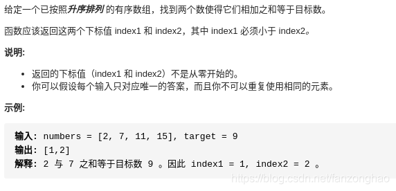 public:vector<int> twoSum(vector<int>& numbers, int target) {int n = numbers.size();int l=0, r = n-1;while(l < r){if(numbers[l]+numbers[r] > target){r -= 1;}else if(numbers[l] + numbers[r] == target){return {l + 1, r + 1};}else{l += 1;}}return {-1, -1};}