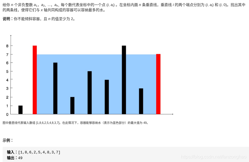 public:int maxArea(vector<int>& height) {int left = 0;int right = height.size() - 1;int max_area = 0;while(left < right){max_area = max(max_area, min(height[left], height[right])*(right - left)); if(height[left]<height[right]){left++;} else{right--;}}return max_area;}