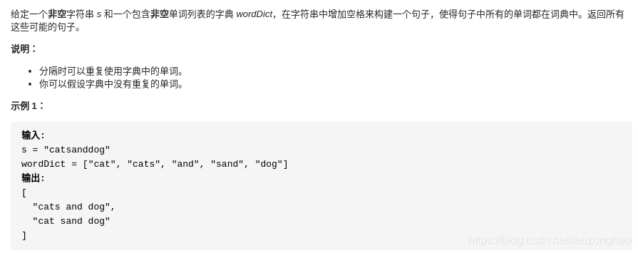 class Solution:def helper(self, s, wordDict, memo):if s in memo:#递归终止条件return memo[s]if s=='':#递归终止条件return []res = []for word in wordDict:if not s.startswith(word):continueif len(word)==len(s):#匹配上刚好相等res.append(word)else:#匹配上 但是字符还没到最后rest = self.helper(s[len(word):], wordDict, memo)for tmp in rest:tmp = word+ " "+ tmpres.append(tmp)print('==res:', res)print('==memo:', memo)memo[s] = resreturn resdef wordBreak(self, s, wordDict):if s=='':return []return self.helper(s, wordDict, memo={})