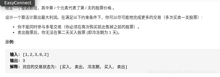 class Solution:def maxProfit(self, prices):if len(prices) <= 1:return 0dp = [[0 for i in range(2)] for i in range(len(prices))]print('==dp:', dp)dp[0][1] = -prices[0]dp[1][0] = max(dp[1 - 1][0], dp[1 - 1][1] + prices[1])dp[1][1] = max(dp[1-1][1], -prices[1])for i in range(2, len(prices)):dp[i][0] = max(dp[i - 1][0], dp[i - 1][1] + prices[i])dp[i][1] = max(dp[i - 1][1], dp[i - 2][0] - prices[i])print('==dp:', dp)return dp[-1][0]#返回没有的最大利润